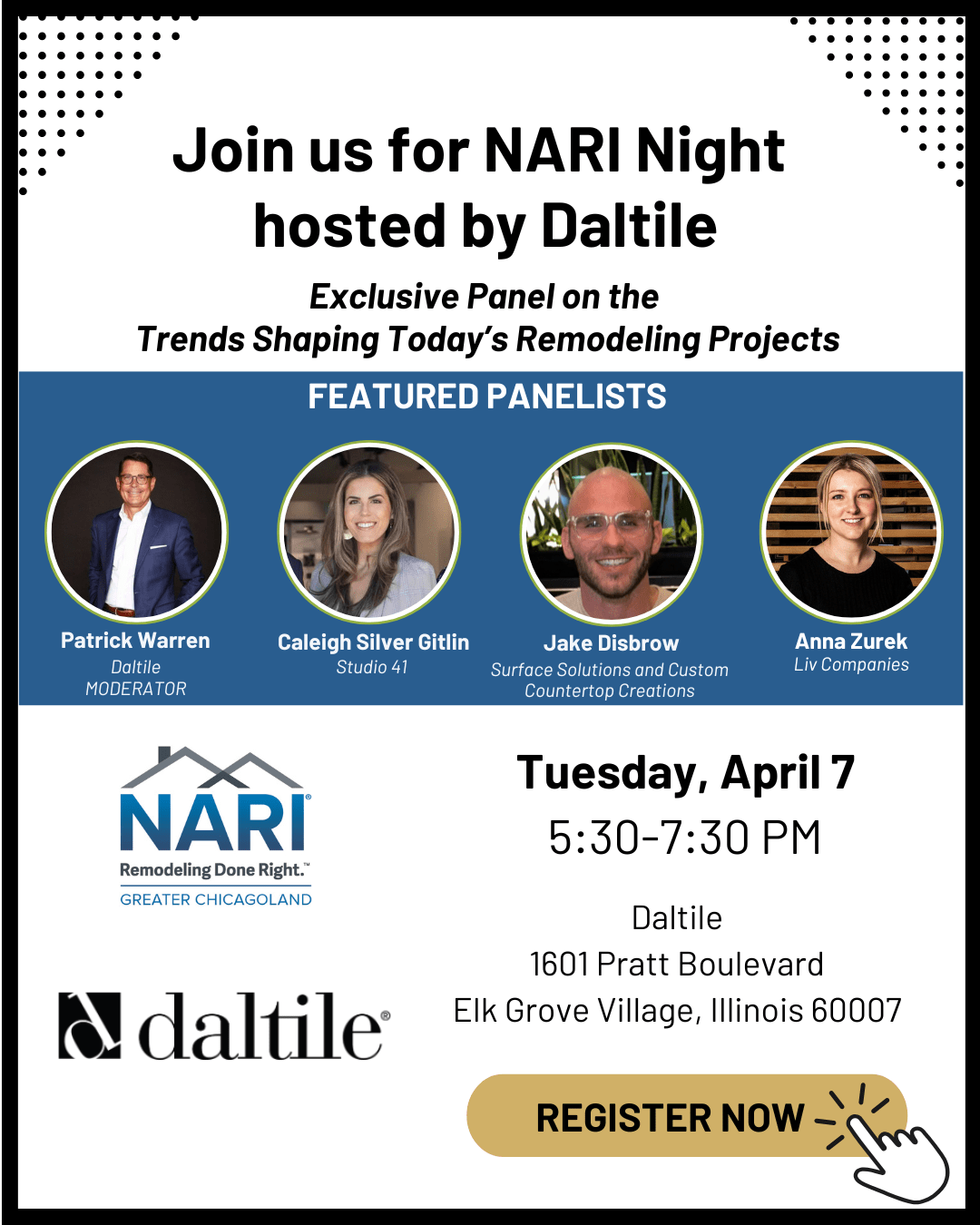 Join us for an evening of networking, connection and education, hosted by Daltile in their Elk Grove Village showroom! Catch the exclusive panel on "Trends Shaping Today's Remodeling Projects" with panel members: